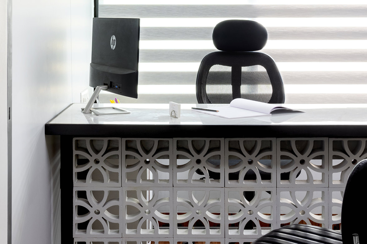 The entryway has a grid-patterned wall with a seating designed as a waiting area, where a blue tiled planter box acts as a partition, giving the office a little privacy and setting the tone for the interior space.