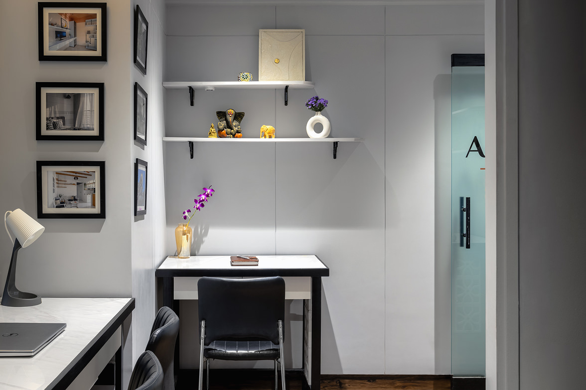 When designing their new Pune workspace, Agneya Designs kept it clean and straight-forward. The interior space becomes a place of serenity, calm and focus. The cool -toned grey walls are lined with sleek monotone shelves while the walls themselves serve as a proud gallery space of the firm’s numerous works.