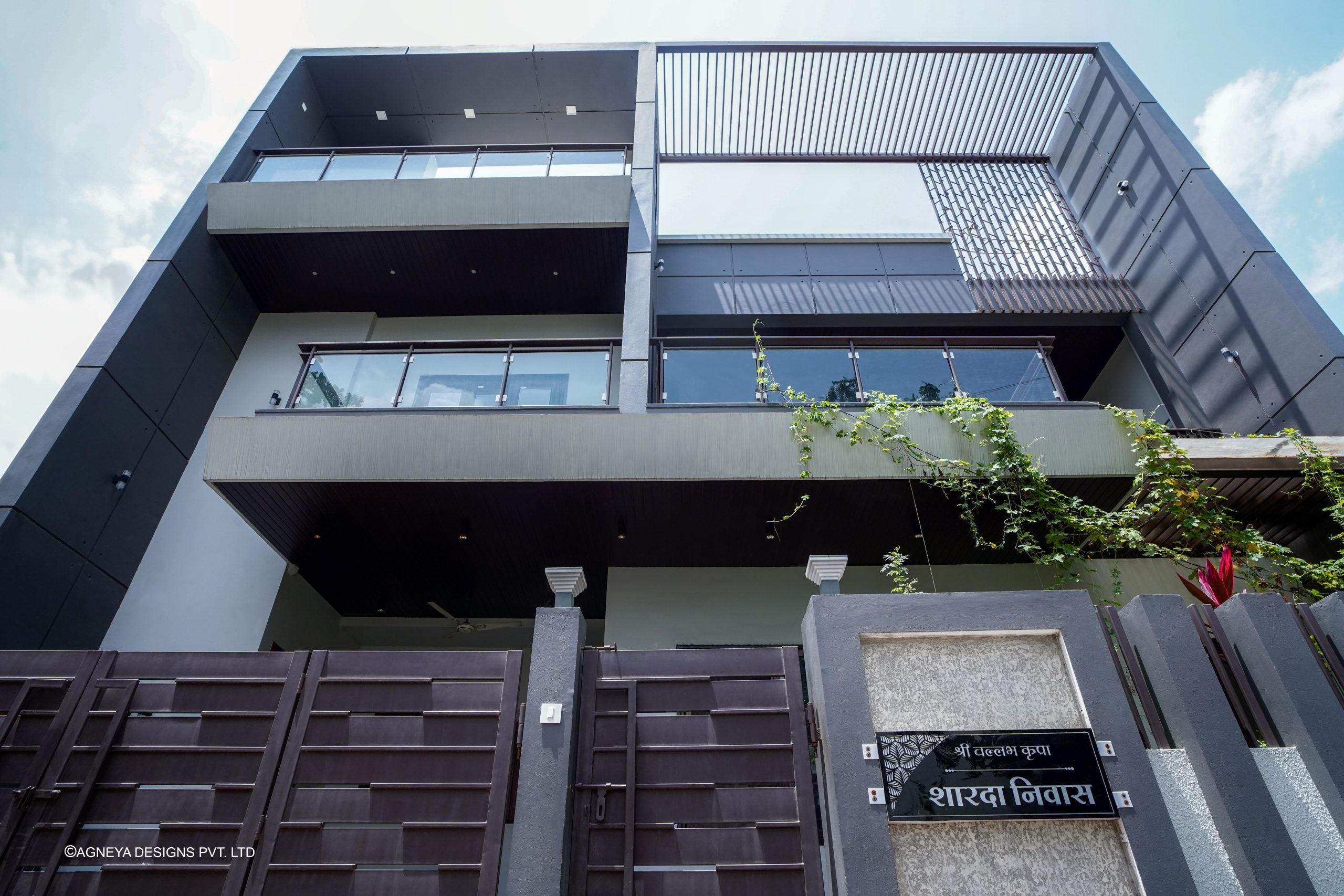 A clean modern design is achieved with a vibrant color scheme and simple geometrical elements. This concrete frame – wraps and connects the facade across all three levels. Steel pergola is added to break the monotony of the structure. The uniquely designed elevation makes it look more open and lighter.