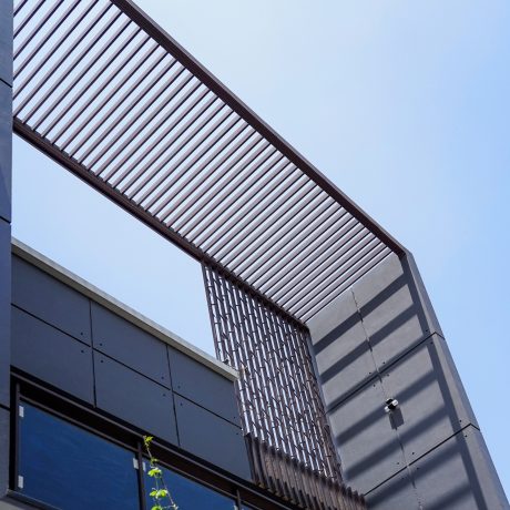 Proportions and geometry, these two principles define the facade of this residence. The subtle shadow patterns created by the sun falling through the multiple screens gives the structure a softness that contrasts with its masculine form.