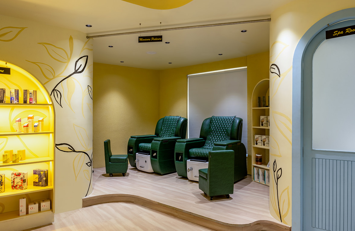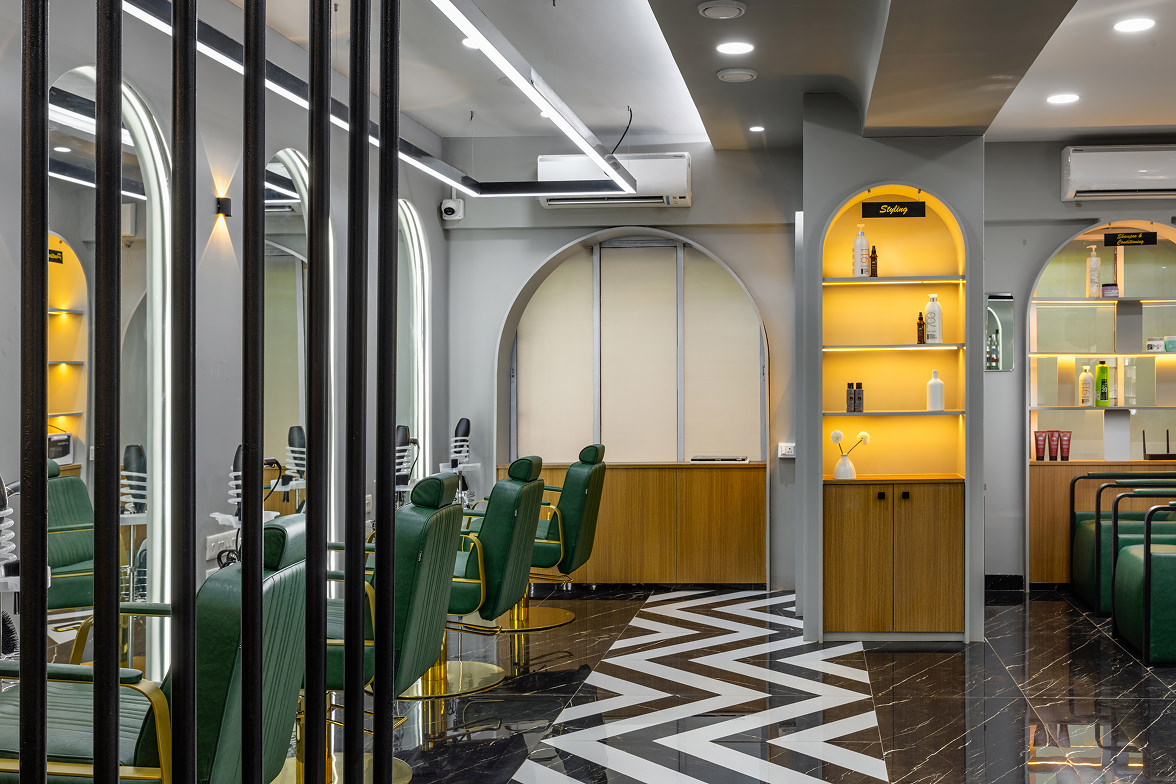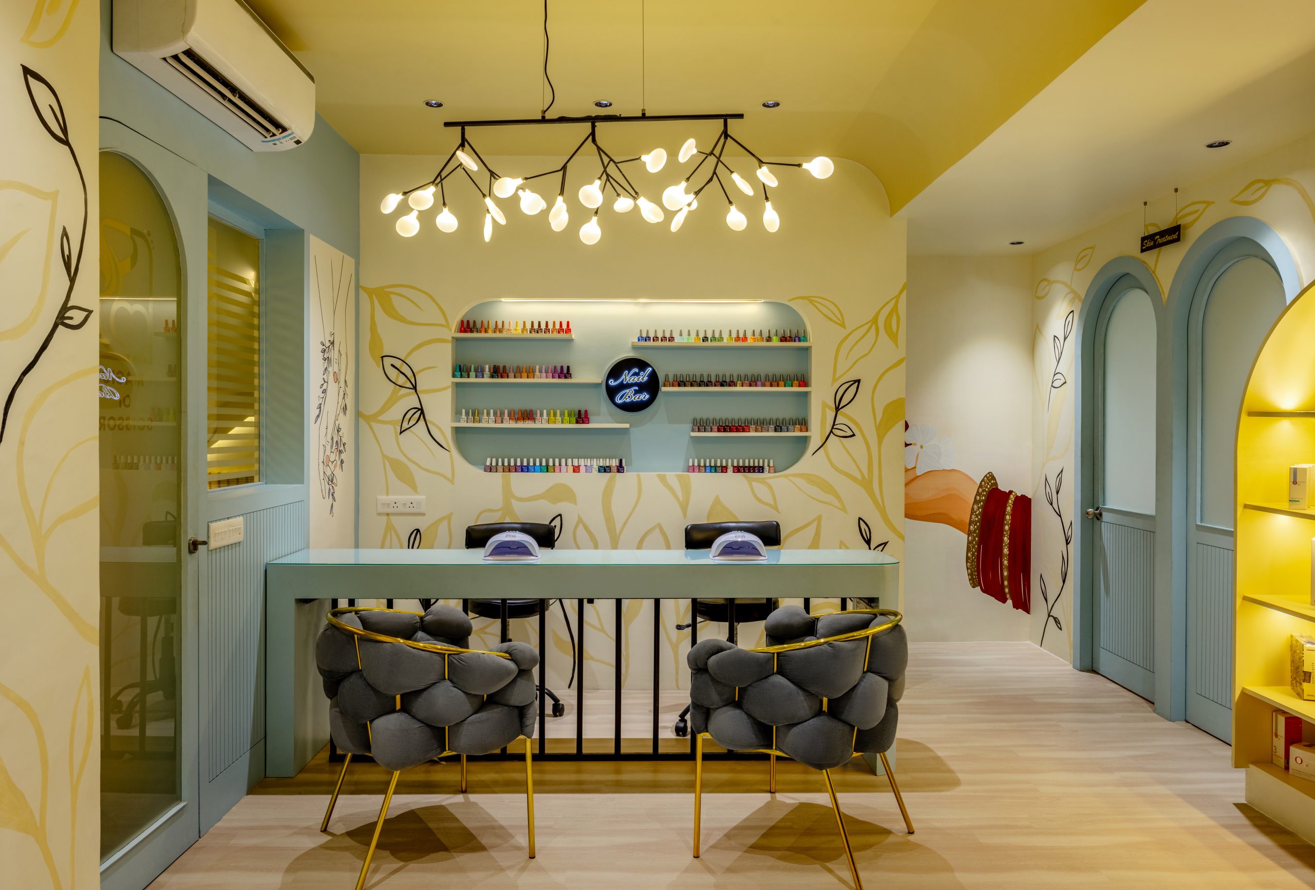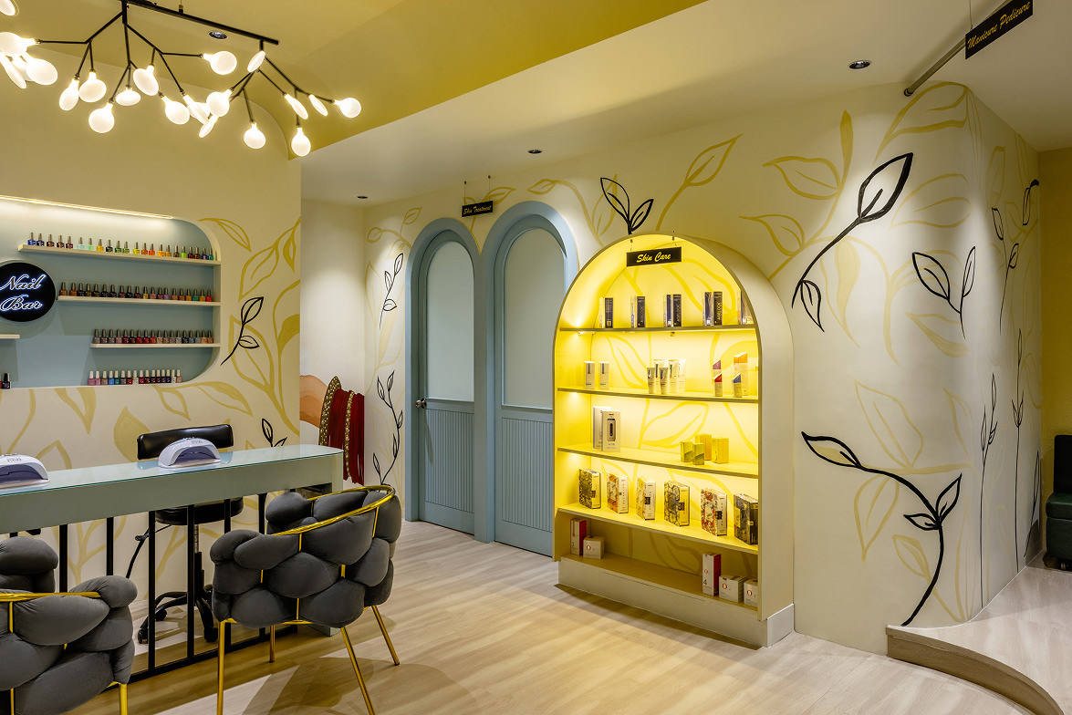 … The first floor of the three-level spa, is the hair grooming section and reception area. The space is a visual spectacle with ambient lighting and neutral toned walls. The black and white flooring pattern stands out among the minimal features and gives the space a whimsical feel. The black metal members acting as a partial screen match the elemental quality and compliment the cool grey surroundings. The waiting area is designed as a cocoon of comfort, where guests can unwind before or after their treatments. Low-seating furniture upholstered in muted pastel shades lends a soothing visual appeal. The brief was simple – the clients were open to anything on the design end, as long as there was ample storage space. Keeping the furnishings light and balanced, storage was created in niches along the walls. Strategically placed shelves inside windows, framed by arches, create a minimal display cum storage, both internally and for the external façade. Second Floor On the second floor, is the spa section and a private bridal room. Warm tones dominate this space, accented by textures of natural wood, creating a grounded yet sophisticated atmosphere. The manicure section features a niche wall, displaying an array of options to the visitors upon arrival. The floral patterns, hand painted by the designers, create an interesting overlay and make for an eye-catching element in and by itself. A deck is created, serving as a more exclusive pedicure area, radiating opulence. The treatment rooms are a private sanctum, bathed in warm hues of beige and taupe. The walls inside each of these rooms feature a unique hand painted wall art by the architects, that add a level of persona to the space. The innermost corner of the floor is reserved as the bridal room. The custom wallpaper at the entrance, guides brides-to-be to a cozy space featuring dainty floral walls and warm toned lighting. The furniture is minimal, a single navy make-up unit crowned by a lit mirror. Third Floor The final level is the academy area where make-up artists hold classes for emerging students. The training section features the same warm hues and minimal accents used downstairs. The columns at entrance have been utilised to create an archway with monotone shelves that double up as a display area. Leading from this point, the ceiling draws attention with organic lines taking shape in muted greens. The overall space was designed to make the process of creative learning a fun and engaging experience, for both teachers and students. Every element of the spa’s interior has been curated to provide a holistic experience of relaxation and rejuvenation. From the earthy tones and natural textures to the thoughtful lighting and sensory elements, the spa’s interiors embody the philosophy of wellness and harmony. It’s a space where every corner tells a story, every material has a purpose, and every detail invites visitors to pause, breathe, and reconnect with themselves.