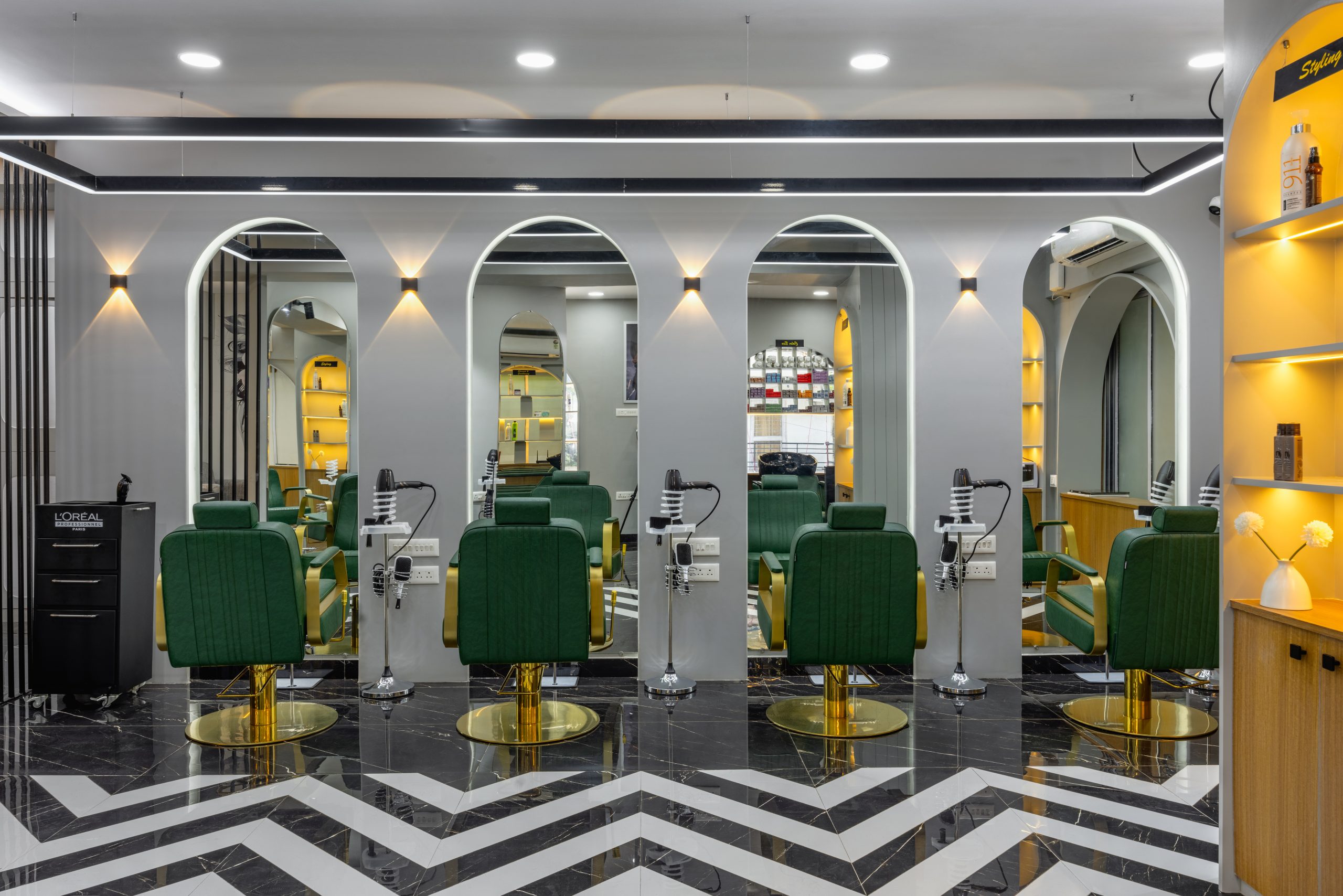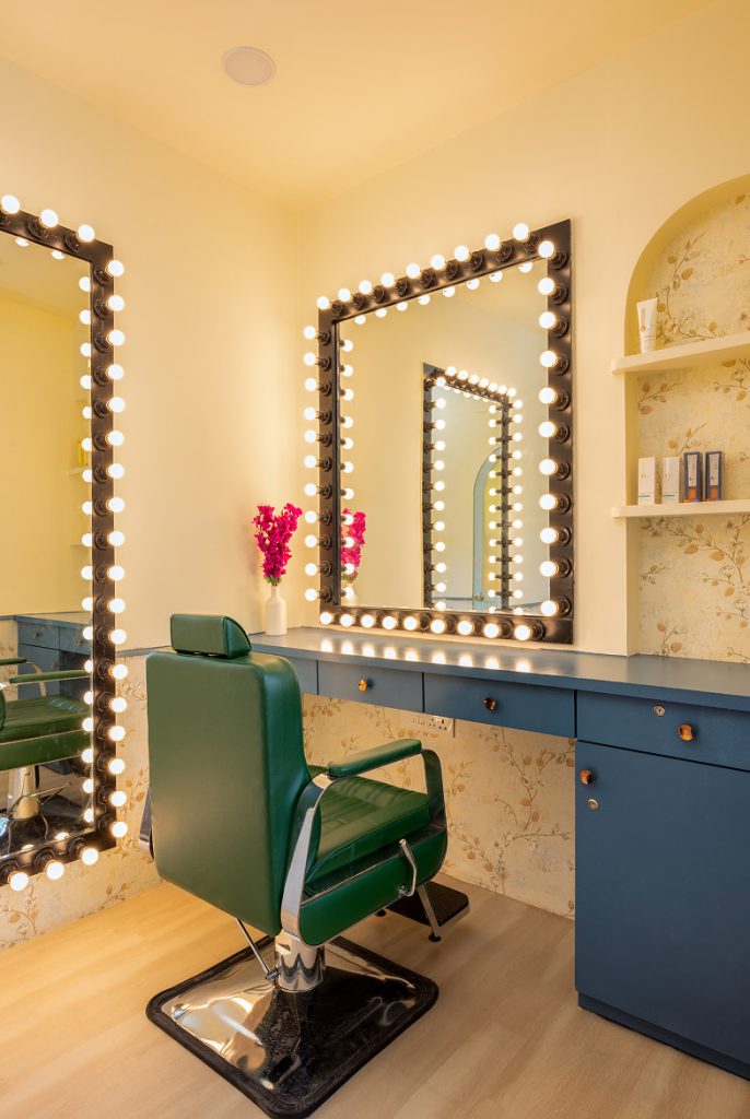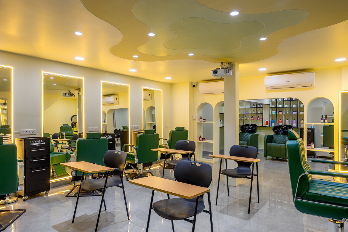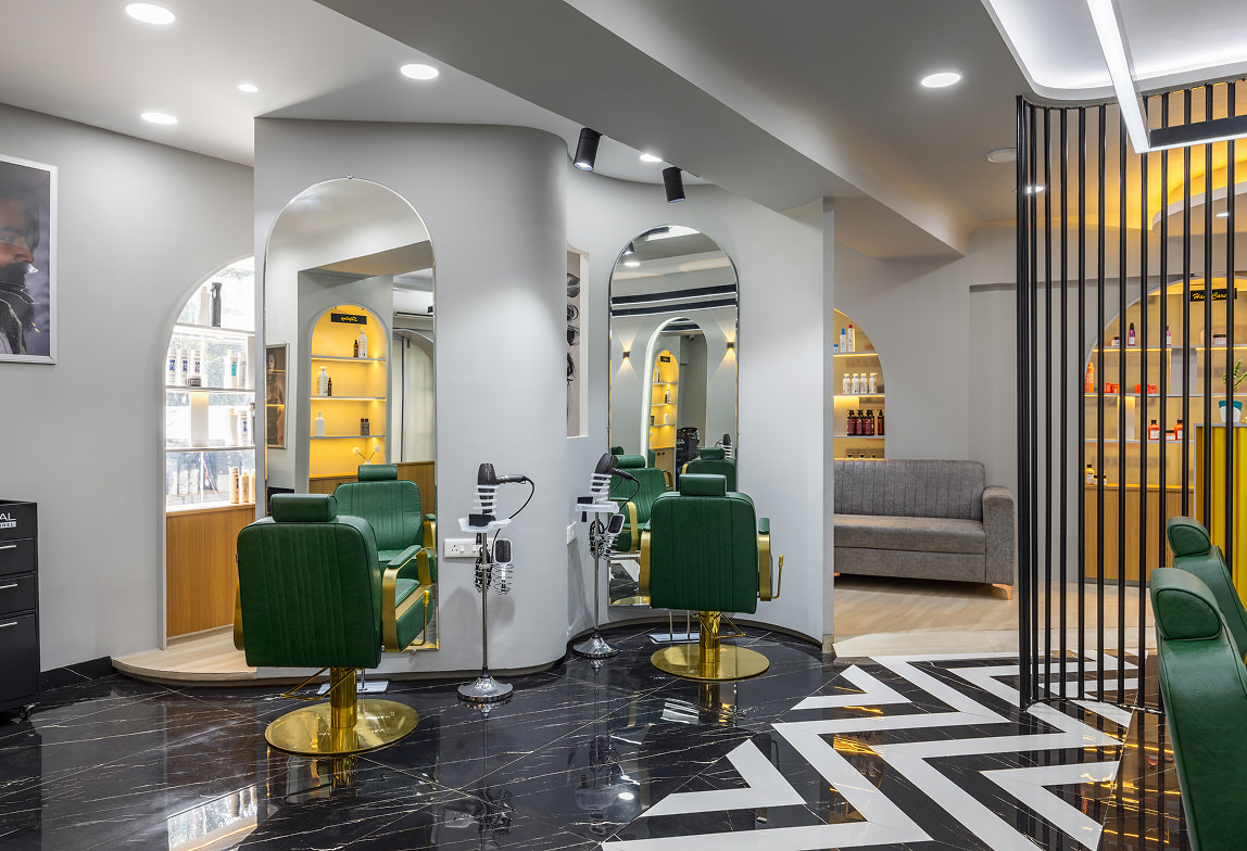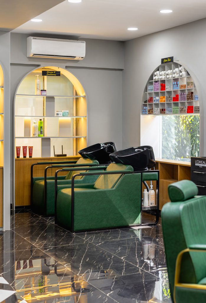 … The first floor of the three-level spa, is the hair grooming section and reception area. The space is a visual spectacle with ambient lighting and neutral toned walls. The black and white flooring pattern stands out among the minimal features and gives the space a whimsical feel. The black metal members acting as a partial screen match the elemental quality and compliment the cool grey surroundings. The waiting area is designed as a cocoon of comfort, where guests can unwind before or after their treatments. Low-seating furniture upholstered in muted pastel shades lends a soothing visual appeal. The brief was simple – the clients were open to anything on the design end, as long as there was ample storage space. Keeping the furnishings light and balanced, storage was created in niches along the walls. Strategically placed shelves inside windows, framed by arches, create a minimal display cum storage, both internally and for the external façade. Second Floor On the second floor, is the spa section and a private bridal room. Warm tones dominate this space, accented by textures of natural wood, creating a grounded yet sophisticated atmosphere. The manicure section features a niche wall, displaying an array of options to the visitors upon arrival. The floral patterns, hand painted by the designers, create an interesting overlay and make for an eye-catching element in and by itself. A deck is created, serving as a more exclusive pedicure area, radiating opulence. The treatment rooms are a private sanctum, bathed in warm hues of beige and taupe. The walls inside each of these rooms feature a unique hand painted wall art by the architects, that add a level of persona to the space. The innermost corner of the floor is reserved as the bridal room. The custom wallpaper at the entrance, guides brides-to-be to a cozy space featuring dainty floral walls and warm toned lighting. The furniture is minimal, a single navy make-up unit crowned by a lit mirror. Third Floor The final level is the academy area where make-up artists hold classes for emerging students. The training section features the same warm hues and minimal accents used downstairs. The columns at entrance have been utilised to create an archway with monotone shelves that double up as a display area. Leading from this point, the ceiling draws attention with organic lines taking shape in muted greens. The overall space was designed to make the process of creative learning a fun and engaging experience, for both teachers and students. Every element of the spa’s interior has been curated to provide a holistic experience of relaxation and rejuvenation. From the earthy tones and natural textures to the thoughtful lighting and sensory elements, the spa’s interiors embody the philosophy of wellness and harmony. It’s a space where every corner tells a story, every material has a purpose, and every detail invites visitors to pause, breathe, and reconnect with themselves.