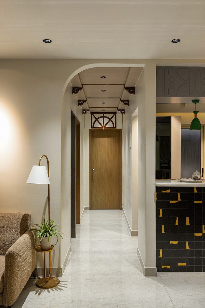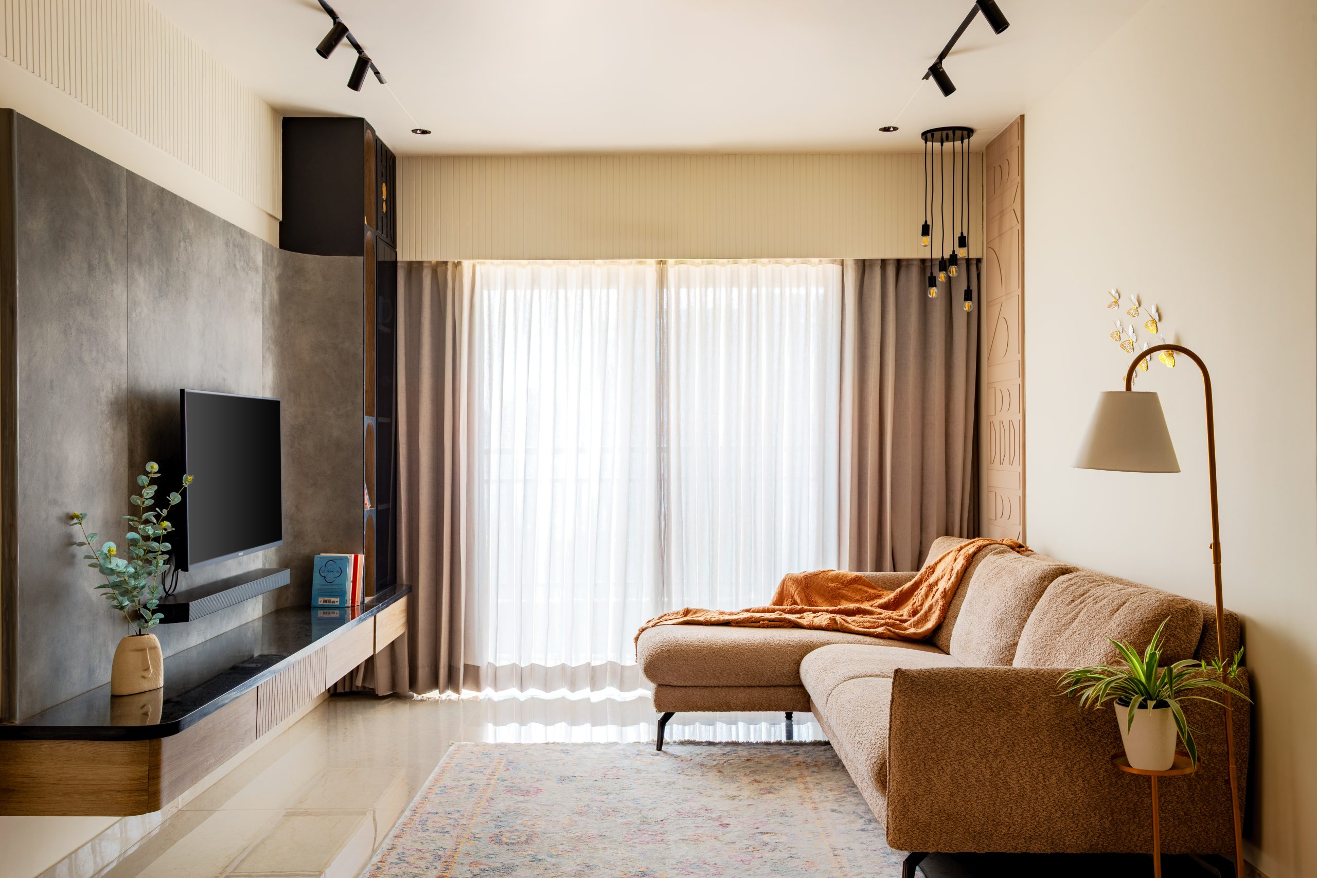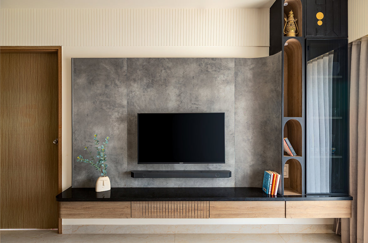 The apartment has many distinct elements, something in every corner, be it the white console in the foyer or the concrete textured TV panel stretched on the wall before a single beige couch. A little more inconspicuous element is the lighting – The warm yellow ceiling of the foyer casts a welcoming glow upon entry and sets the tone for the interior area.