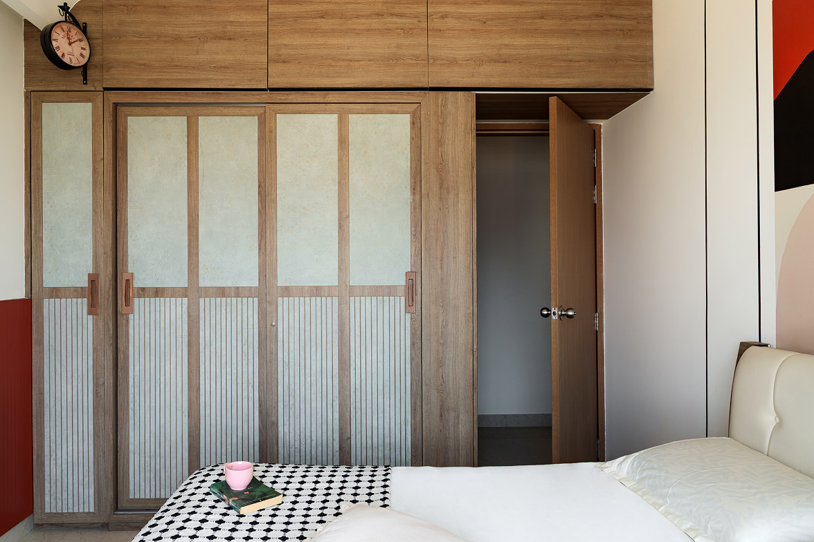 … The marginally open kitchen has a beautiful white quartz countertop with almost blood-red bottom cabinets. The antique brass fittings tie the look together into a coherent vision. The internal bedrooms are designed in an array of different materials. Rattan shutters framed inside a powder blue, is an unlikely combination, but one that works nonetheless. Pairing that with an orange bed back makes the room pop to life. The sunlight filtering in from the floor -to – ceiling windows directly in front turns the orange into a glowing silhouette somewhat resembling molten lava. The second bedroom designed for the young-couple’s father has an earthy quality owing to the muted mint and wooden wardrobe. In complete contrast, the walls are painted a bright red halfway through. The colours work together to produce a balanced montage. The design throughout the house uses bright, clashing colours but composed in a way that they work for each other instead of against. Clever disposition of shapes and shades, and interesting geometries in every corner is the fountainhead of this home. The entire residence is designed in a way that is sure to leave a lasting impression with its inhabitants – one in particular, an 8-year-old girl. The instructions given to the designers for this room were that “the space should be joyful”. The small corner was reserved for the youngest member of the family, and has a pale pink ceiling, with a small custom pull-out bed, a matching pink hut shaped wardrobe and a light filled study nook. Small details were given extra attention like the handle in the form of a tree trunk, a valley-inspired bed back or the painted black boards. Just like its owners, the interior space feels young, inspired and a little experimental.