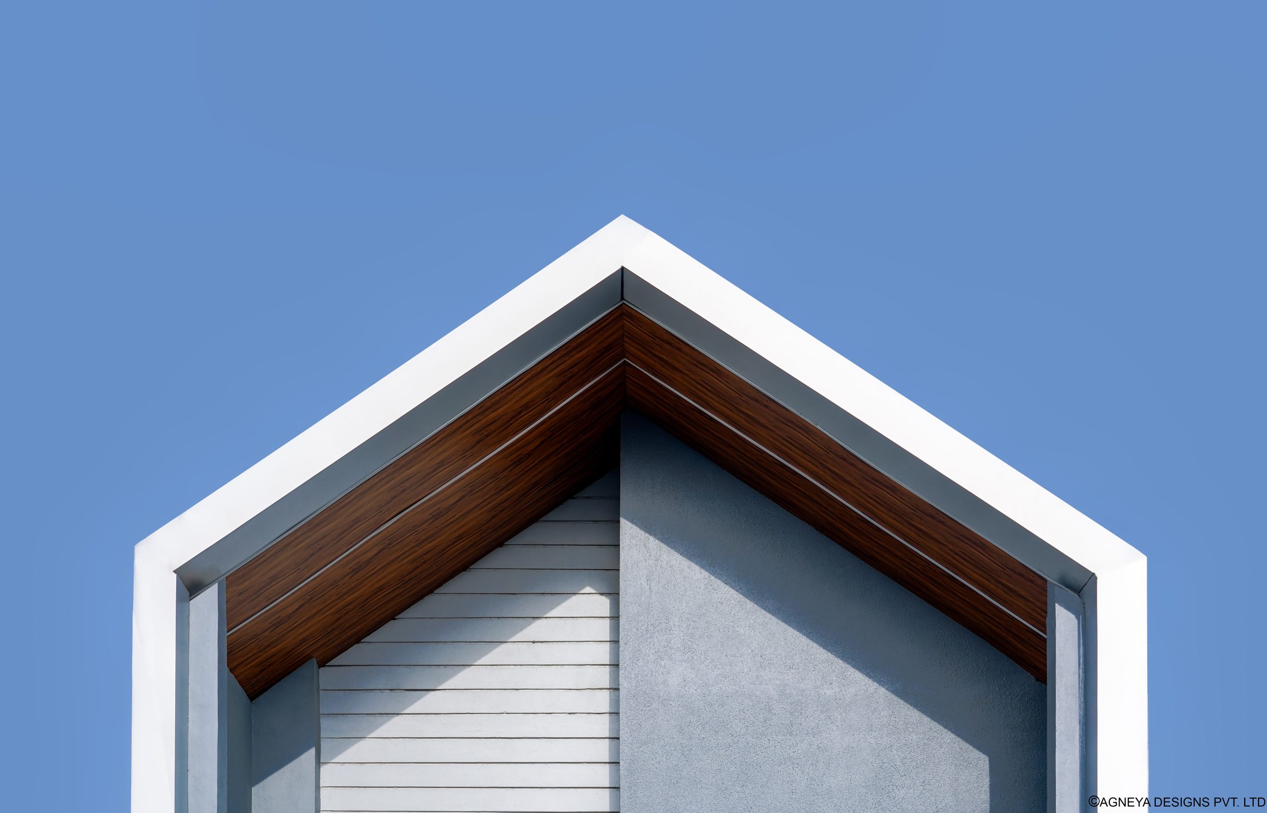 A sharp slope and stark clean lines. This roof of a bungalow in Khargone, Madhya Pradesh makes a bold statement with its combination of dark wood, white and gray concrete. The amalgamation of angles and cool toned materials make the roof an edgy element and pulls the attention for the facade right to the top.