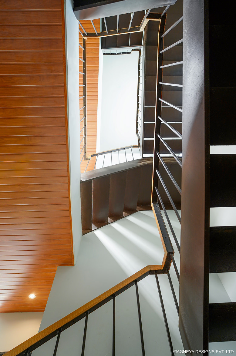 The cantilevered balcony juts over onto the pool, acting as a viewing deck over the water body, from where one can appreciate the ambiance of the backyard with the pool.